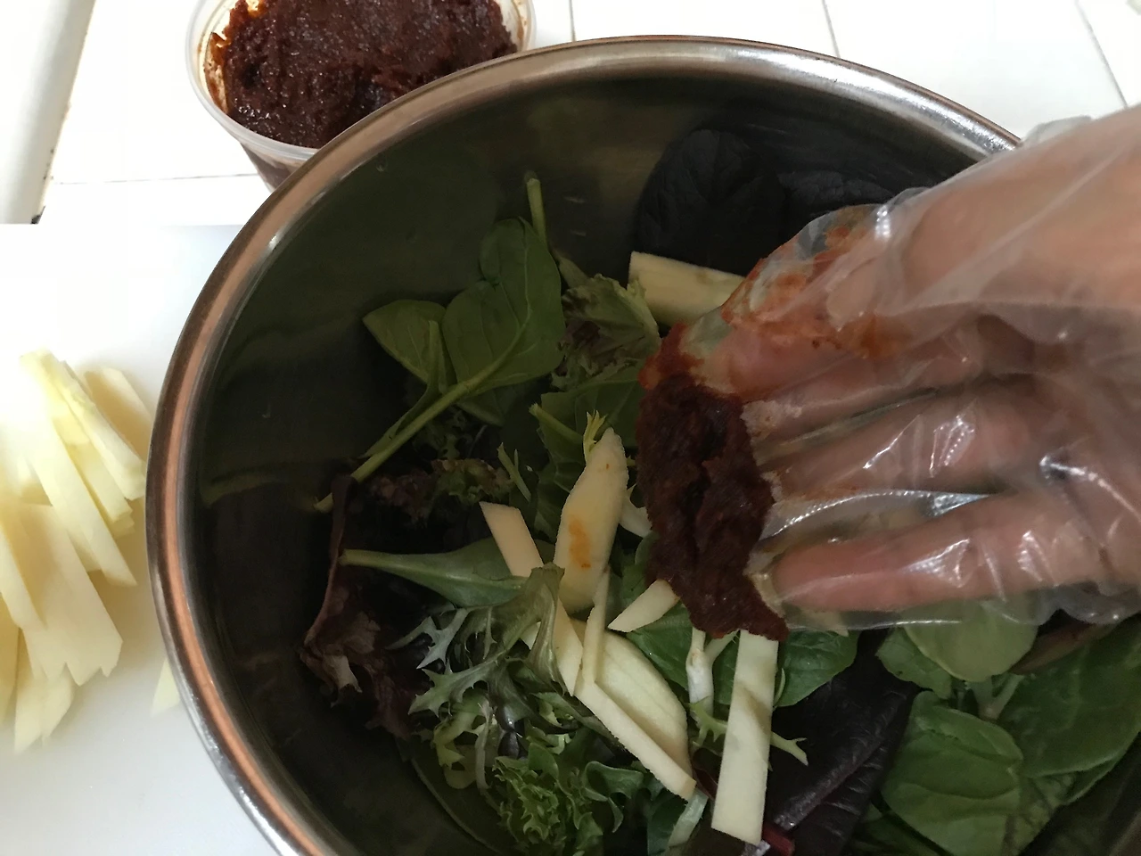 미리 한가득 만들어 놓은 양념장에 사과를 준비.