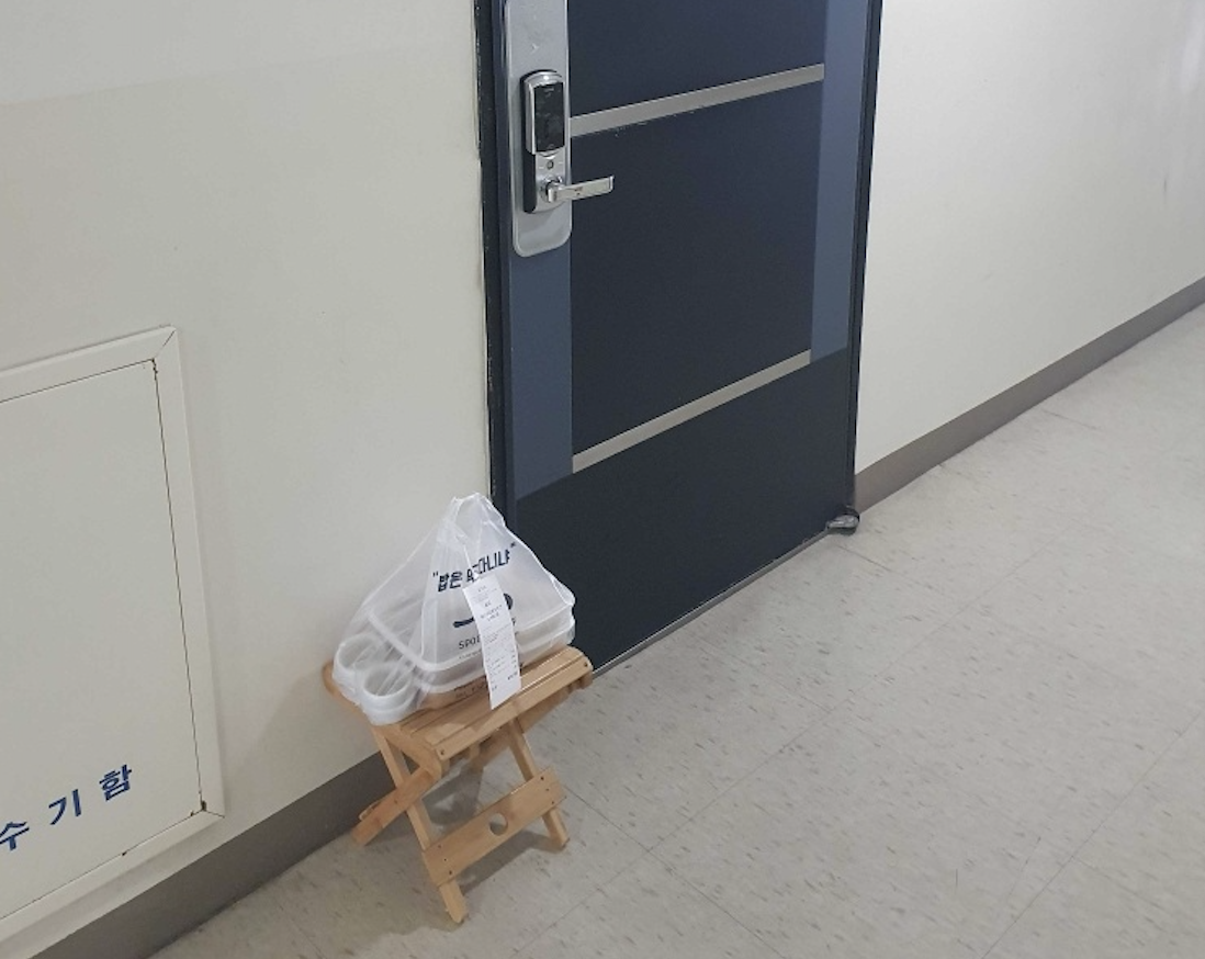 배달 주문을 마치면 간의용 의자를 현관 밖에 내어 놓고 벨소리나 두드리는 소리에