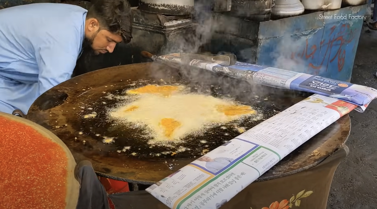 엄청나게 큰 기름이 있는 용기에 한 손으로 버무려서 넣는데
