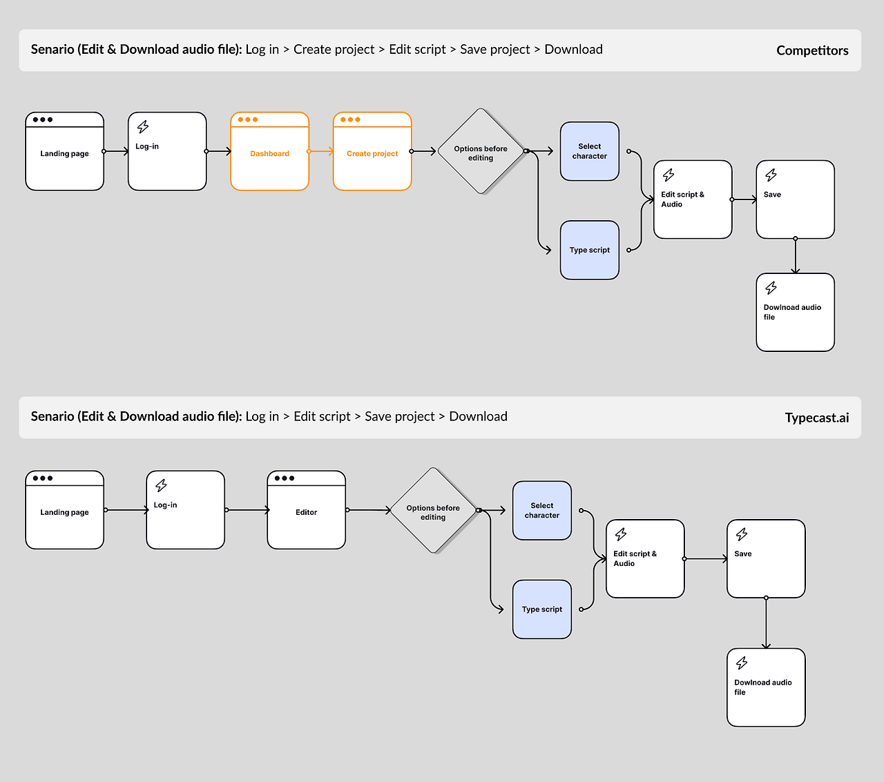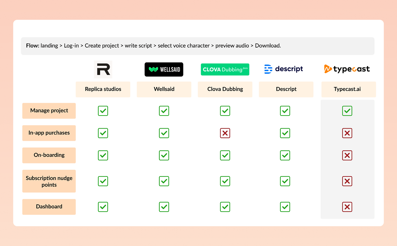 타깃 고객에게 적합한 기능과 제품을 찾는 좋은 방법의 하나인 경쟁사 분석을 하였다. 현재 시장에 어떤 제품들을 고객들이 어떻게 이용을 하고 있는지 이해를 하고 일반적인 사용자 *멘탈 모델과 흐름을 찾기 위해 시장 내 각 제품에 대한 리뷰를 검토했습니다. 기존의 멘탈 모델을 활용하여 사용자가 새로운 모델을 학습하기보다는 그들의 *JTBD(Jobs-to-be-done)에 최대한 집중할 수 있는 쉬운 경험을 만들어주도록 타사와 비교하면서 경험을 설계해 나아갔다.