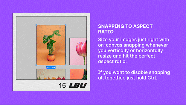 크기를 조정하는 동안 화면 비율이 완벽해지는 순간 이미지가 스냅 된다. Ctrl 키를 누르고 있으면 모든 스냅을 일시적으로 비활성화할 수도 있다.