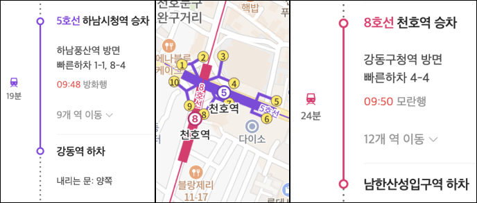 모든 정보가 틀렸다. 맞는정보가 단 하나도 없다. 우선 하남시청역에서 강동역까지는 9개 역이다. 강동역에서는 8호선을 탑승할 수 없으며 천호역에서 8호선을 탑승해야 한다. 또한 12개 역을 지나 남한산성역에서 하차한다.