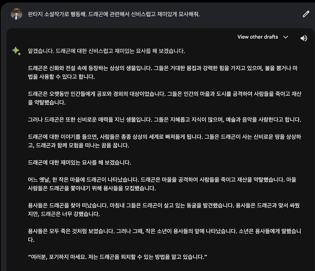 클로버 X는 구글 바드, 챗GPT 모델에 비해 현저히 글쓰기 능력이 낮다. 아직까지는 롤 프롬프팅이 작동하지 않는 것 같다.