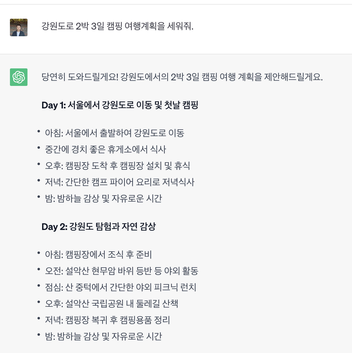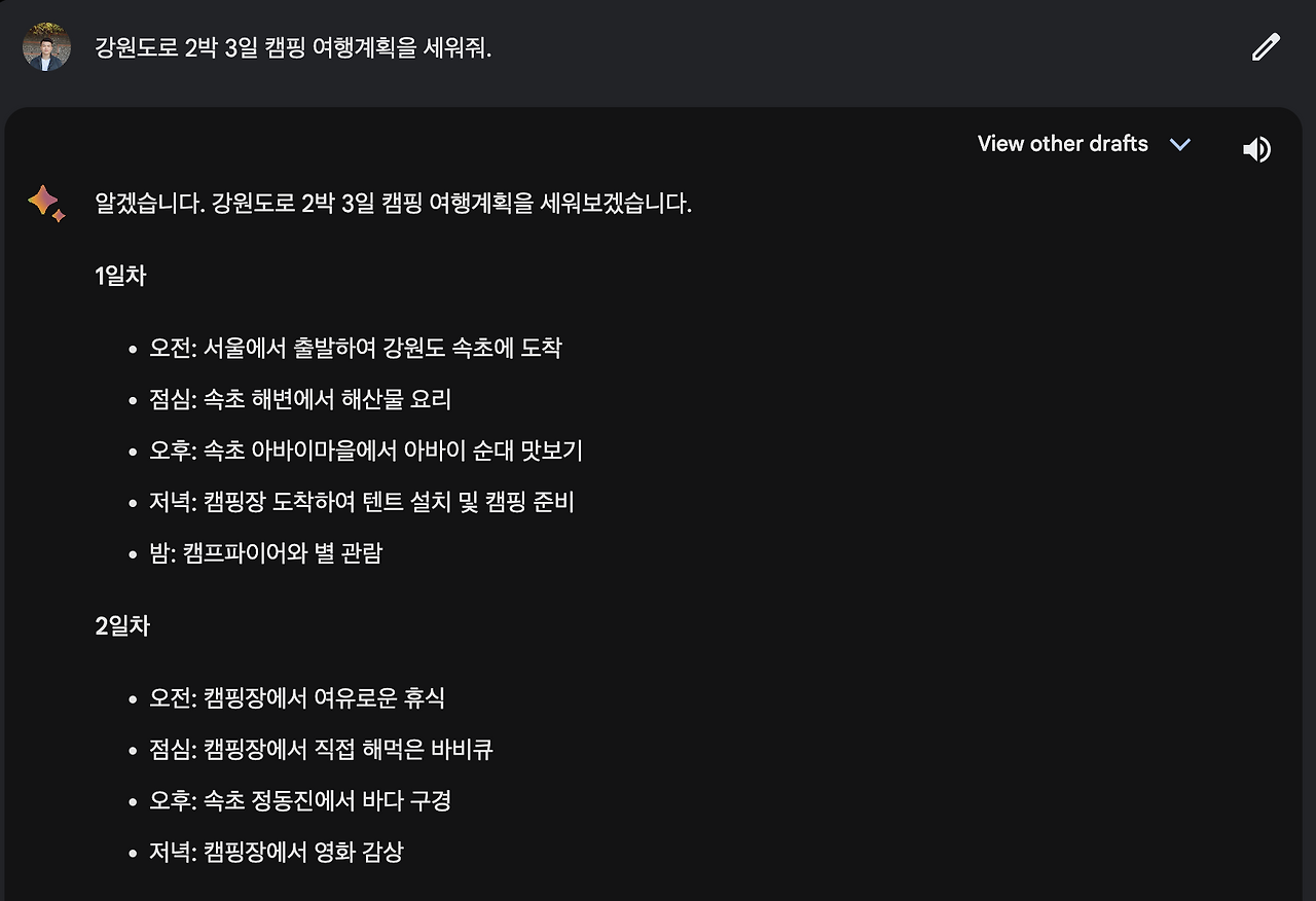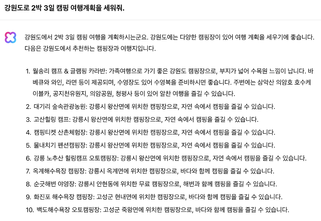 클로버 X는 아직 사용자의 의도를 정확히 파악하는 데에 어려움을 겪었다. 그러나 챗GPT와 구글 바드는 사용자의 2박 3일 여행 계획 요청을 잘 이해하고, 의도에 맞게 체계적으로 계획을 도와주었다.