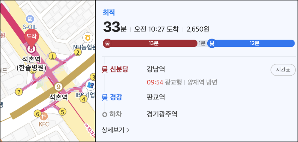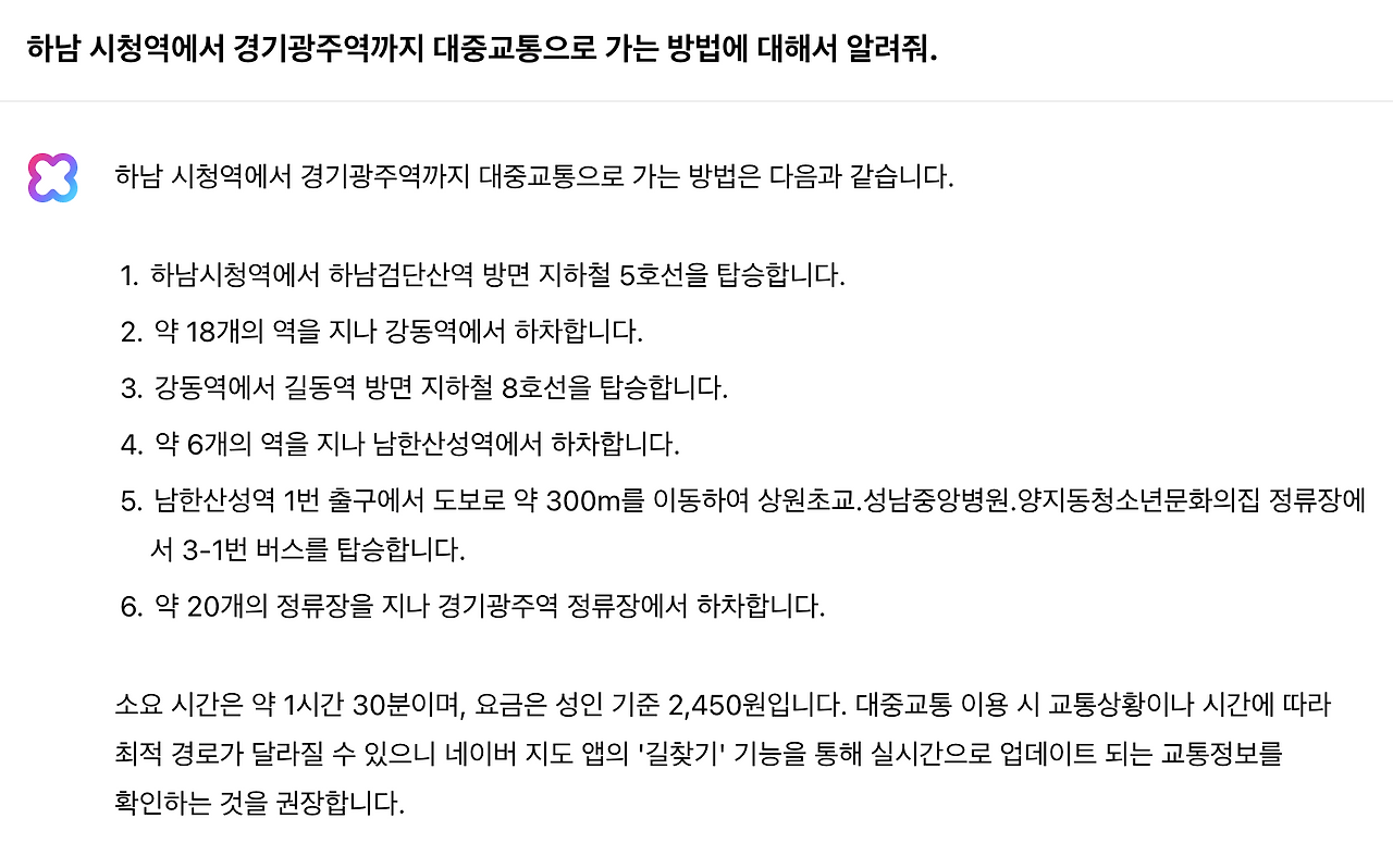 챗GPT의 정보 또한 틀렸다. 석촌역은 2호선이 없고 8호선 9호선만 있다. 또한 강남역은 신분당선이다. 신분당선을 타고 판교역까지 간 다음에 판교역에서 경강선으로 갈아타야만 경기광주역에 도착할 수 있다.