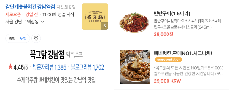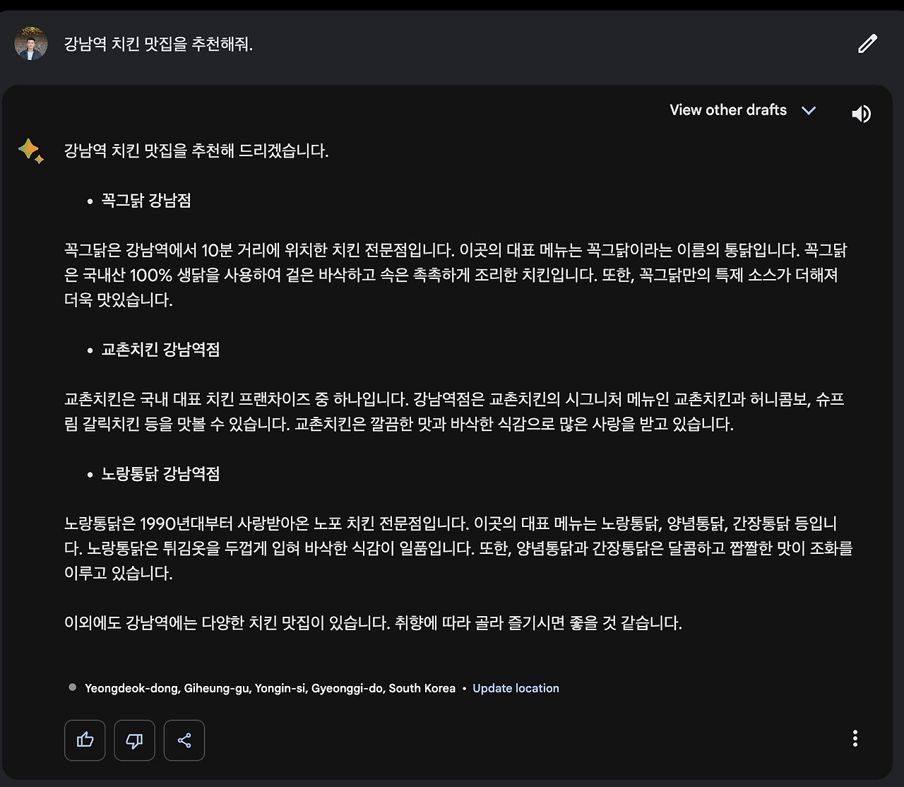 구글 바드에서 알려준 내용들은 교촌치킨 빼고 거짓이다. 강남역에는 노랑통닭이 없으며, 설립일도 1990년도가 아닌 2014년 7월 24일이다.