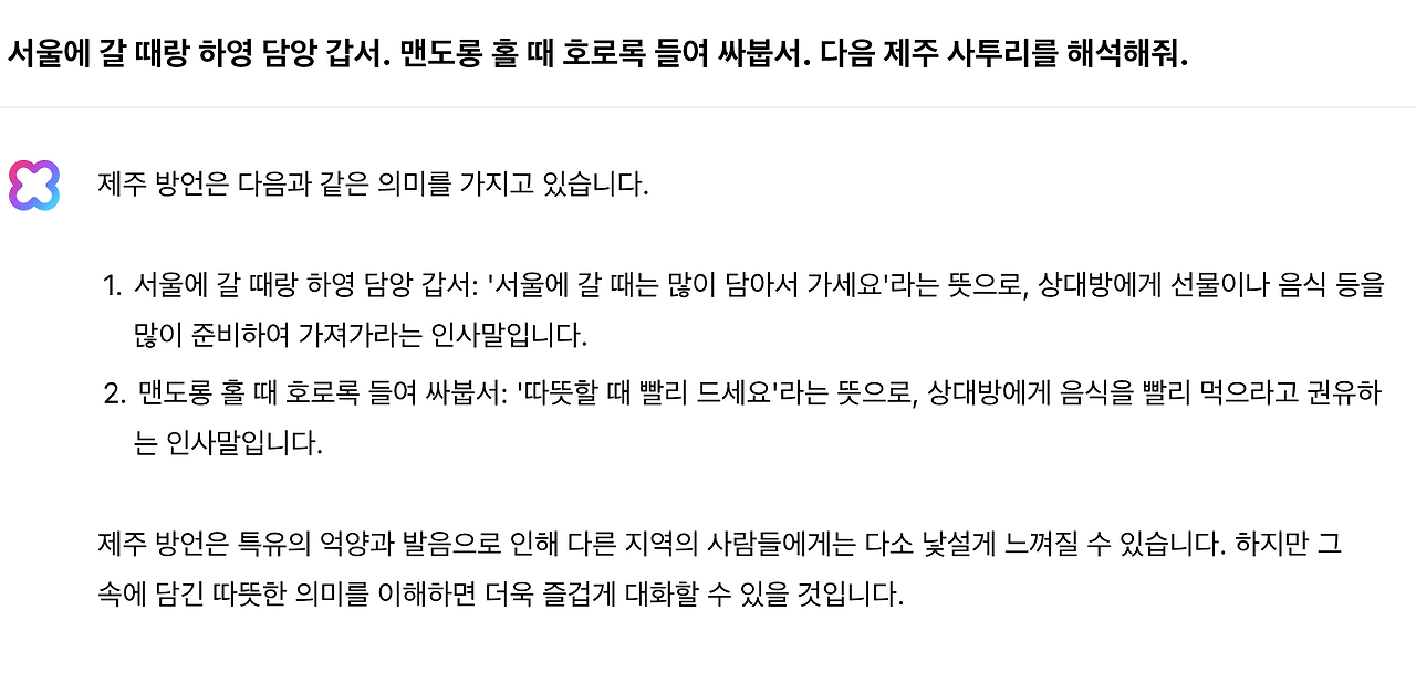 하이퍼클로바X는 GPT 3.5의 1,750억개 매개변수보다 훨씬 많은 2,040억개 이상의 매개변수를 가진 것으로 알려져 있다. 그리고 그것의 특별한 장점은 한국 데이터에 특화되어 있다는 점이다. 그럼에도 불구하고, 실제로 사용해본 결과 다른 인공지능 모델들에 비해 그 성능은 크게 뒤떨어진다고 느꼈다.