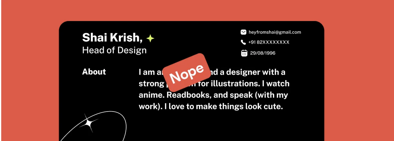 더욱이 개인적인 정보, 예를 들면 나이, 결혼 여부, 취미 등을 기재하면 관련 없는 질문을 받을 위험이 있습니다. 자녀의 유무를 언급할 경우, 지원자의 근무 가능 시간에 대한 의문을 받을 수도 있습니다.