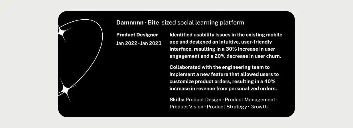 - [특정 팀원]과 함께 [특정 디자인 스프린트]를 주도하며 [특정 결과]를 얻었습니다.