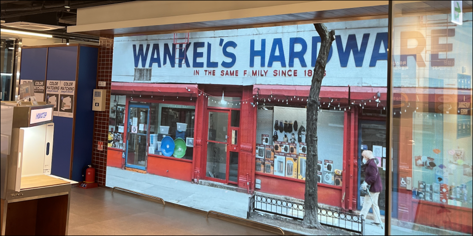 입구 인포메이션을 지나면 고화질 스크린에 뉴욕의 Wankel's hardware 철물점 영상이 재생된다. 입구 전시 장비의 디자인 영감이 이곳에서 왔음을 분명히 보여준다.