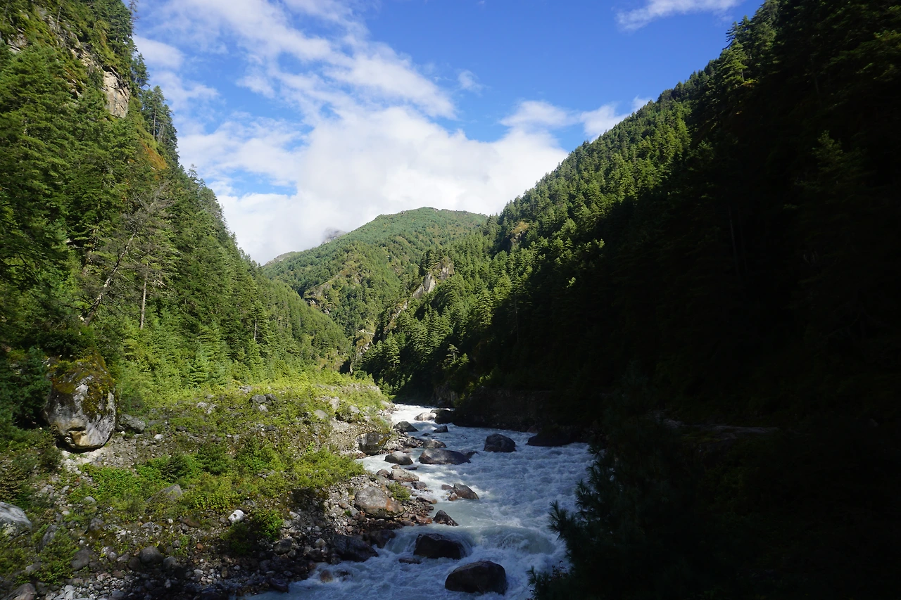 전날과 같이 오전 7시쯤 아침 식사를 하고 8시 30분경 숙소를 출발했다. 어제 답사를 나섰던 계곡길을 따라 경쾌하게 발걸음을 옮겼다. 비구름이 갠 계곡 사이로는 맑은 햇살이 내리쬐고 있었다. 이날의 목적지는 남체(Namche. 해발 3,440M).