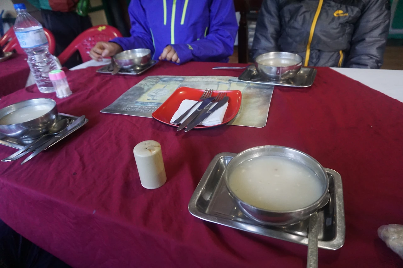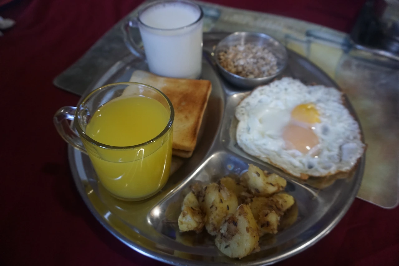 6시 30분 기상, 7시 아침 식사는 이제 규칙적인 일과가 되었다. 각자 갈릭 수프 한 그릇 씩을 포함해 이것저것 든든하게 아침을 먹었다. 특히 찬이 주문한 Trekker's Breakfast라는 메뉴가 훌륭했다. 스텐 식판에 토스트, 반숙 계란 프라이 두 개, 시리얼, 주스와 더불어 통감자 볶음을 푸짐히 볶아 내왔다. 이 지역은 감자 농사를 많이 하는데 지대가 높아 마치 강원도 감자 마냥 찰지고 달다.