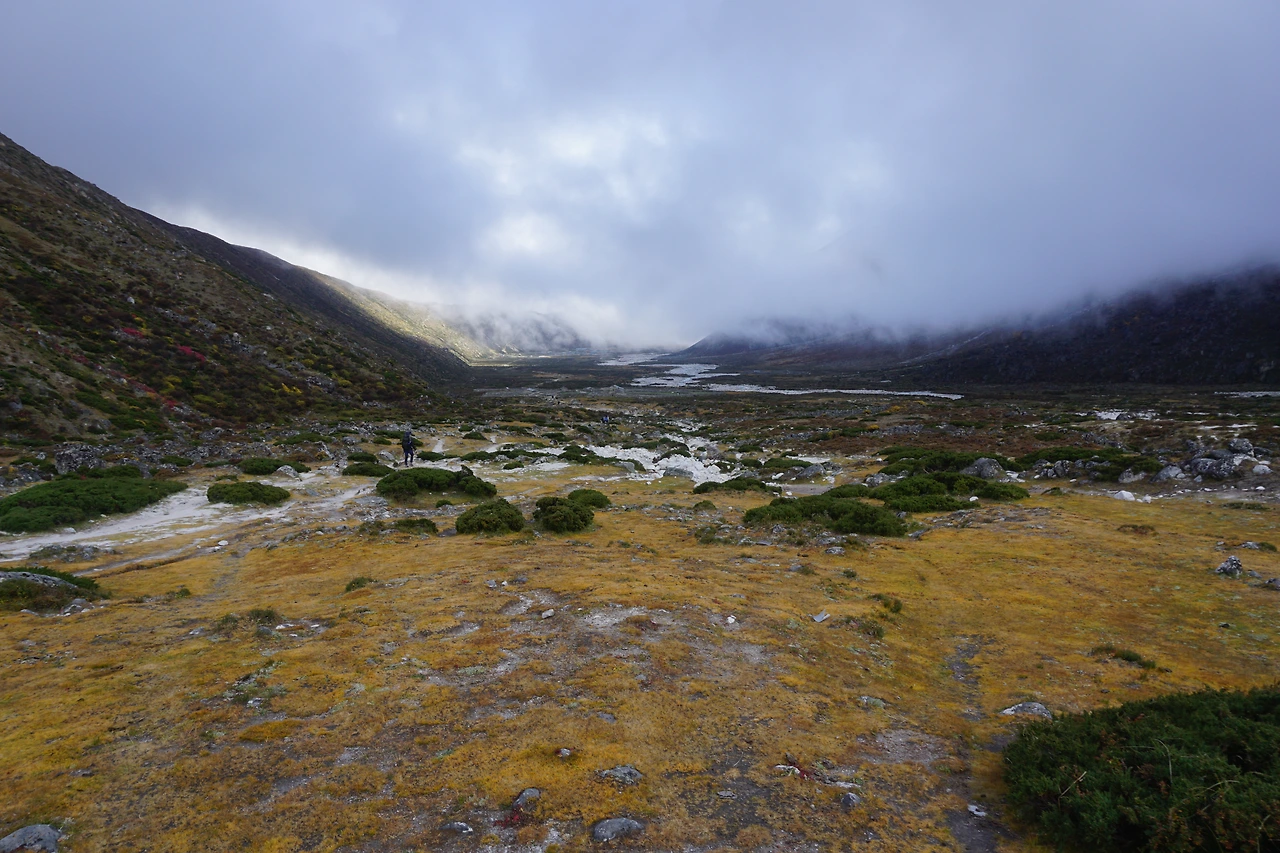 메모리얼 파크를 지나 페리체로 내려가는 길은 계곡물이 흐르는 구릉지다. 머리 위로는 구름 떼가 히말라야 정상을 향해 기어 올라가고 있었다. 가끔은 구름 사이로 설산이 얼굴을 내밀고는 다시 구름 속으로 사라진다. 고요하고 평화롭다.