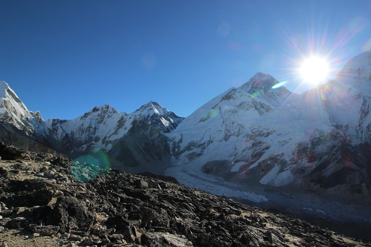 칼라파타르 정상에 도착한 것은 6시 45분쯤. 타이밍이 절묘했다. 몇 사람 앉으면 발붙일 자리도 없는 꼭대기 고지로 기어올라가니 옆에 한국 남성이 앉아 있었다. 언제부터 앉아 계셨냐고 물어보니 한 시간을 앉아 있었다고 한다. 그리고 한 십분 쯤 지났을까, 일곱 시가 조금 되지 않아 에베레스트 뒤로 이글거리는 해가 떠오르기 시작했다. 차가운 그늘이 드리웠던 설산 능선 위로 순식간에 이글거리는 햇살이 터질 듯 차오른다. 얼른 선글라스를 꺼내 썼다. 이 순간을 기다리고 있던 수십 명의 사람 무리가 여러 나라 말로 탄성을 질러댔다.