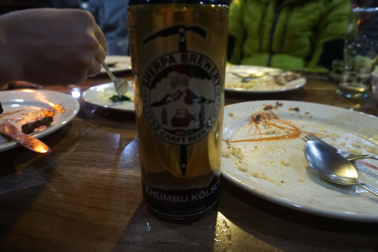 저녁 메뉴로는 실로 오랜만에 제대로 된 단백질인 야크 스테이크를 주문했다. 윗동네에서는 주문할 때마다 번번이 재고가 없다는 답변이 돌아왔던 '진짜 고기'. 그리고 쉐르파 비어도 주문했다. 이날 먹은 맥주 맛은 인간의 언어로는 표현하기 어려울 것 같다. 모두 접시와 잔을 깨끗이 비웠다.