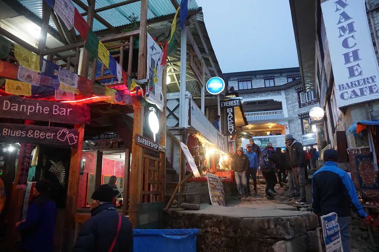 어느덧 해가 지고 있다. 마을 주변으로 히말라야의 구름이 자욱하게 드리운 가운데 남체의 저녁거리는 야시장처럼 반짝인다. 콜드 플레이의 음악과 테이크 아웃 커피숍이 새삼 이국적으로 느껴진다. 몽롱하고 촉촉해진다. 이제 본격적으로 알코올을 들이부을 차례다.