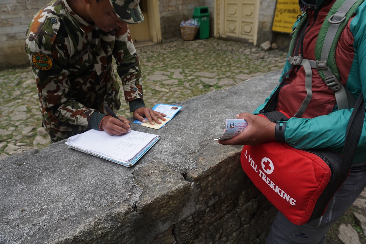 내려가는 길은 마치 주말의 북한산에 온 것 마냥 북적거렸다. 북한산 풍경과 다른 것이 있다면 사람들의 국적이 다양하다는 것, 그리고 사람 무리 사이로 짐승 무리들이 짐을 실어 나른다는 정도. 두 시간 남짓을 걷자 트레킹 이틀 차에 묵었던 조르살레에 도착했다. 전에 묵었던 롯지를 찾아가 레몬 진저 티를 미디움 팟으로 주문해 마시며 휴식을 취했다. 차를 다 마신 뒤, 올라갈 때 맡겨뒀던 짐을 찾고 다시 출발했다. 한 삼십여분을 걷고 약간의 오르막을 걷자 국립공원 관리사무소가 나온다. 올라갈 때 확인증을 받았던 곳이다. 일행들보다 먼저 도착해 기웃거리고 서있으니 군인이 다가와서 허가증(Permit)을 보여달라고 한다. 난 뒤에 오는 가이드가 가지고 있으니 잠시 기다려 달라고 했다. 잠시 후 일행들과 시리가 뒤따라 도착했고, 시리는 우리 네 명의 허가증을 꺼내 확인해줬다.