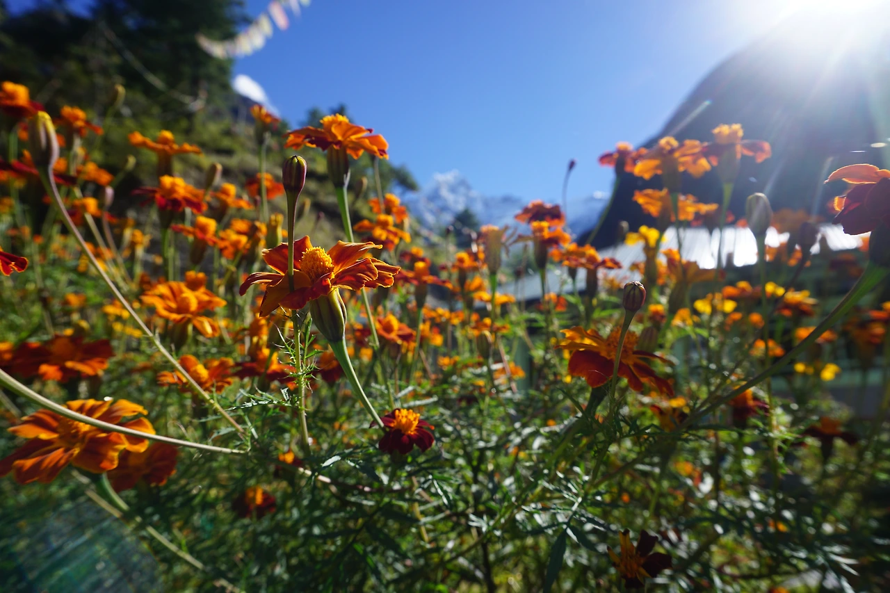 볕 좋은 길을 따라 쉬엄쉬엄 걸었다. 길가의 마당에는 이따금씩 꽃밭이 있었다. 볕을 받으며 무리 지어 서 있는 꽃들 저 너머로 설산이 보인다. 이제 설산은 아주 멀다. 그만큼 속세와 가까워졌다는 뜻이다.