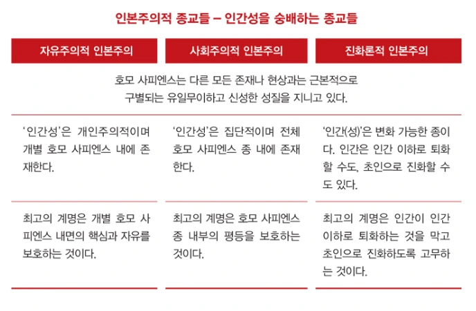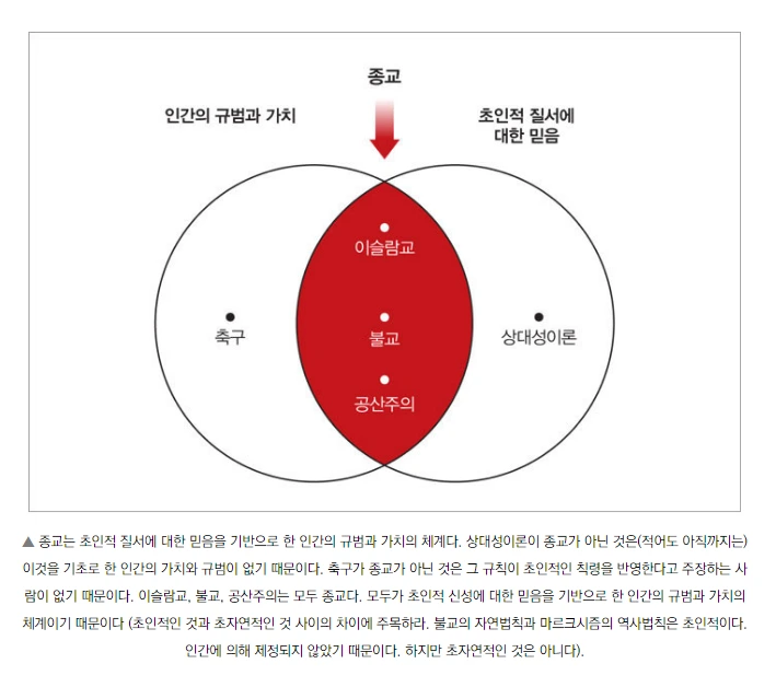 특히 종교에 대한 저자의 관점이 흥미로웠다. 저자는 종교를 '초인적 질서에 대한 믿음을 기반으로 한 인간의 규범과 가치 체계'로 정의한다. 그에 따르면 자유주의, 사회주의 등 이데올로기도 종교의 범주에 포함시킬 수 있다는 것이다. 아래 표에 저자의 관점이 잘 나타나 있다.