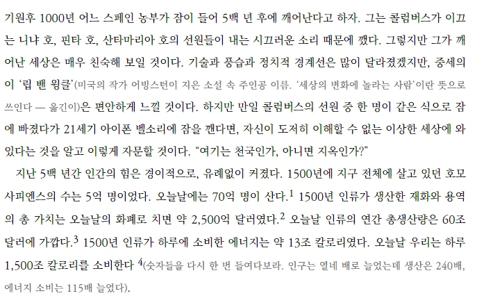 과거 5백 년간 인류의 발전은 그 이전에 비해 경이로운 속도로 진행되었다. 이러한 일이 가능했던 이유가 바로 과학혁명이었다. 과학은 인류의 생산성을 급속도로 증가시켰고, 시간이 갈수록 발전의 속도는 더욱 가파르게 증가했다. 그 결과 사피엔스는 이전과는 완전히 다른 세계를 살게 되었다. 아래 본문 내용을 읽으면 무슨 말인지 확 와 닿을 것이다.