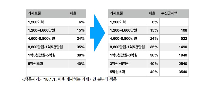 한편 직장인의 소득은 매년 조금씩 변하므로, 그에 따라 과표 세율과 세액이 달라진다. 국세청은 대개 근로자의 직전 연도 납입 세액을 기준으로 임금 증가분을 반영하여 세율과 세액을 계산, 매월 급여에서 원천징수한다. 과표 세율은 아래와 같이 누진세를 적용, 고소득자에게 더 높은 세율을 부과한다.