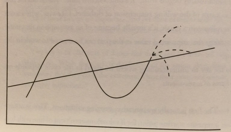 저자는 시계추 비유를 좋아한다. 아날로그 시계가 익숙지 않은 요즘 아이들에게는 잘 안 먹힐 것 같은 비유인데, 나는 약간은 옛날 사람인지라 직관적으로 쉽게 와 닿았다. 아래 선의 직선이 어떤 자산의 '가치'라고 한다면, 가격은 직선 주위를 어슬렁 거리는 포물선처럼 계속 진동한다는 얘기다. 사실 주식 시장의 가격 변동은 항상 이렇다. 모든 투자자가 가치투자의 교본대로 가치 평가를 해서 사고 판다면 결코 일어날 수 없는 일이다.