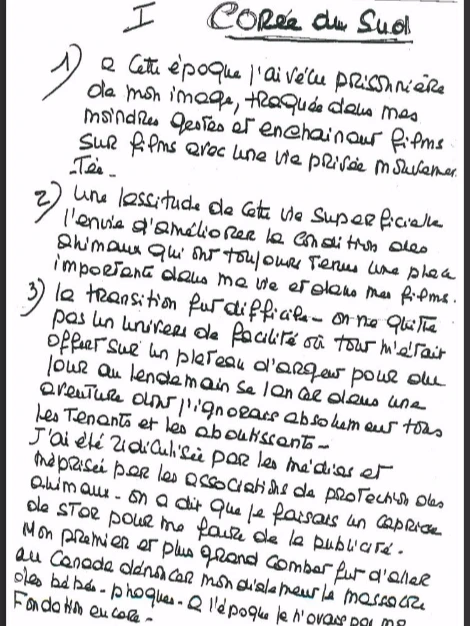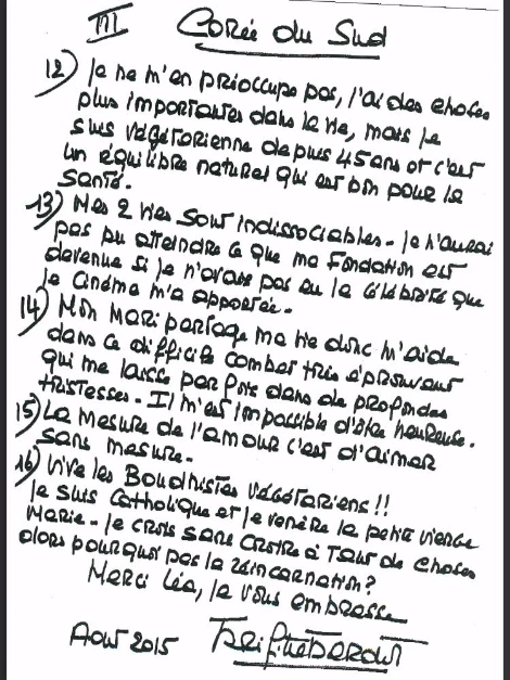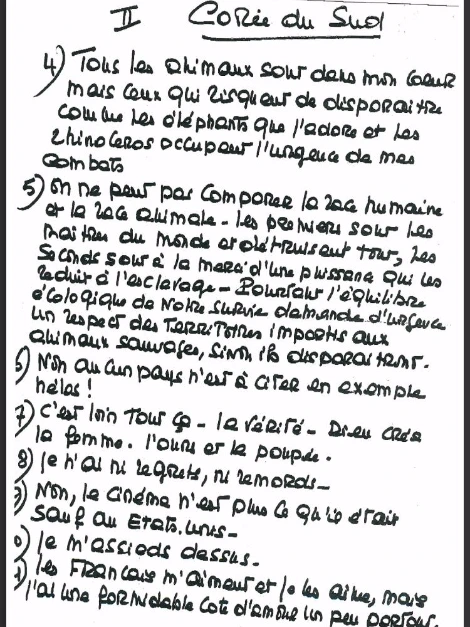 한 시대를 풍미했던 배우로서, 여자로서, 한 인간으로서 80세를 넘어선 브리짓 바르도의 인생 이야기를 듣고 싶다고 요청했더니 그녀가 손글씨로 답장을 보내왔다. 정말 고마웠다. 빽빽하게 채워진 편지가 나를 감동시켰다.
