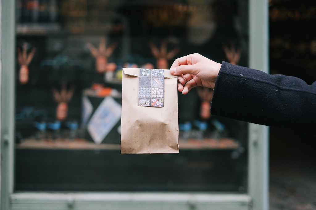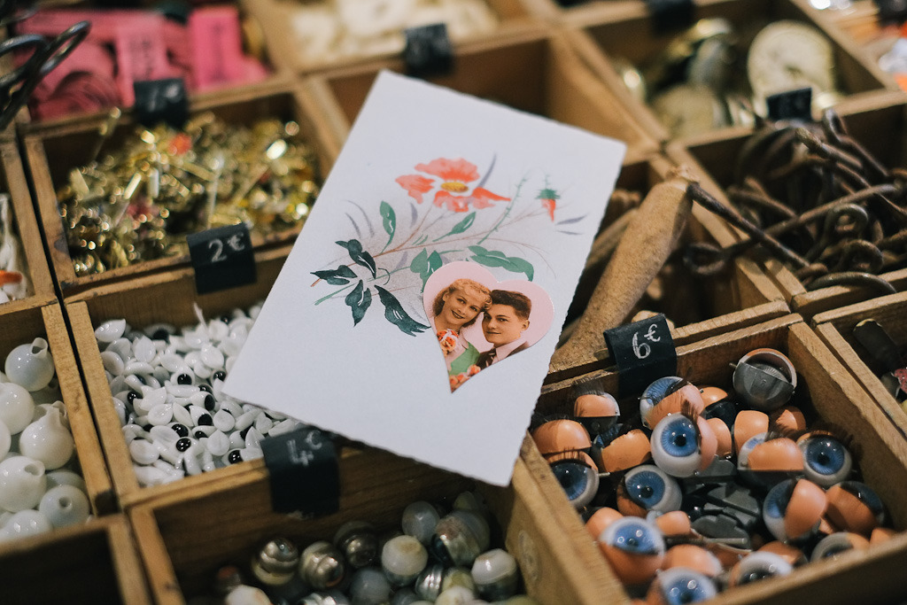 사랑이 느껴지는 엽서를 골라 계산대에 가니 사랑이 이루어지길 바란다며 선물로 주겠다고 한다. 간단한 포장도 꼼꼼하게 봉투 위에 상점의 명함까지 스테플러로 콕 찍어준다. 그런 마음이 고마워 차마 포장지도 버리지 못하고 소중히 모아두었다!