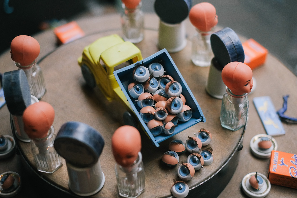 테크닉을 설명해드릴게요. 원래 그 물건이 만들어진 목적대로만 보지 않고 고정관념을 떠나 자유롭게 배치하는 방식이에요. 예를 들어 면도솔, 화병, 그리고 인형은 서로 연관성이 없지만 각자의 기능이 있는 것들이죠. 면도솔은 면도하기 위해 화병은 꽃을 꽂기 위해 인형은 놀이를 위해. 같이 두면 이 각개 물건의 의미가 없어지고 남는 건 3개의 재료뿐이죠. 이 3개의 조합을 어떻게 보느냐는 것은 각자의 상상력과 영감에 달려있다고 할 수 있죠.