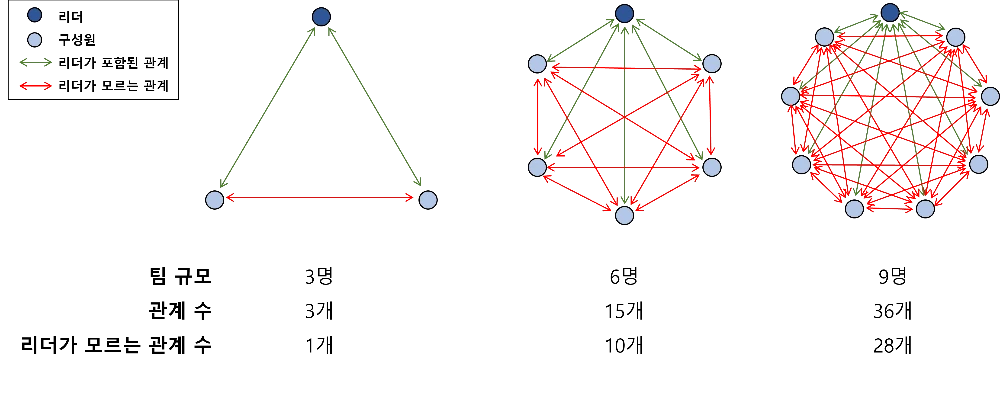 이렇게 팀 내 관계 숫자가 늘어나고 복잡해지고 파악이 어려운 상황에서 팀을 매니지하는 난이도는 그야말로 기하급수적으로 늘어난다. 좋은 리더라면 이런 변화에 대하여 민감하게 인지하고 적절한 대응이 필요하다.