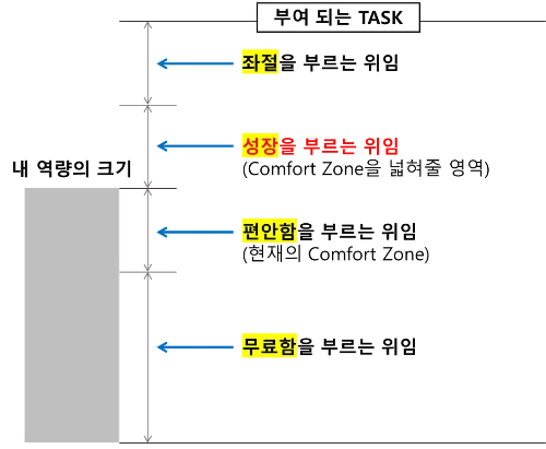 바로 이 과정에서 “성장”이 일어납니다. Comfort Zone을 넓히는 것이 이런 의미입니다.