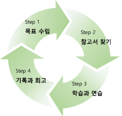 쉬운 이해를 위해 도식화를 해보면, 성장은 아래 4가지 단계를 통해 이루어집니다. 첫 번째 단계는 "목표 수립"이고, 그다음으로는 목표 달성을 위한 "참고서 찾기" 단계를 거칩니다. 참고서를 찾으면 이를 토대로 스스로 "학습과 연습"을 하는 것이 세 번째 단계이고, 이를 "기록하고 회고"하면서 완전히 내 것으로 만들고 다음 성장을 준비합니다.