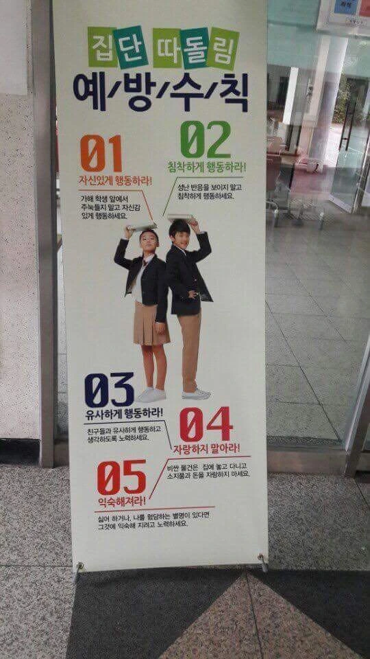 조금은 핀트에 어긋난 이야기를 해 보자면, 얼마 전 인터넷에서 본 (sns와 블로그 등에서 화제가 된 사진이나 정확한 원 출처를 찾을 수 없었다) 사진에 말문이 막혔다. 학생들에게 가르쳐야 할 것은 피해자가 '어떻게 행동해서 왕따를 당하지 않을지'가 아니라 가해자가 왕따를 시키지 않도록 '선택'하게 만드는 것이 아닐까? 아래 판넬에 적인 항목들에 의하면 집단 따돌림이 마치 피해자 스스로 피해자가 되지 않도록 '선택'하는 것이 된다.