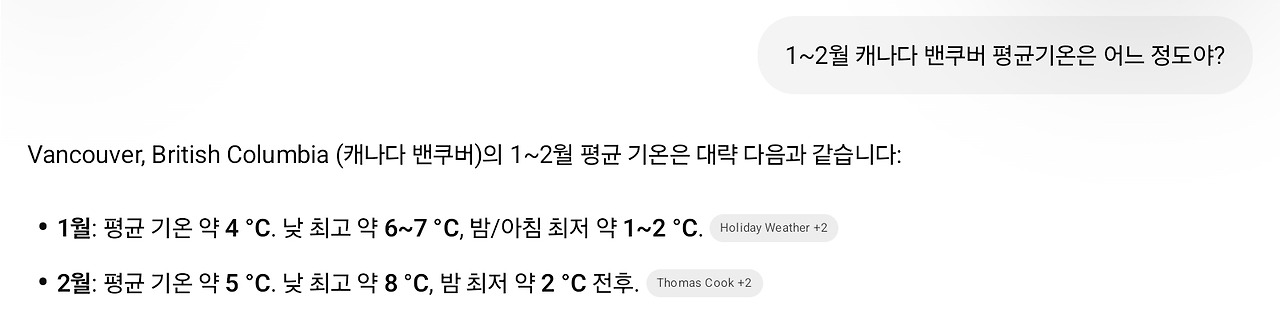 '1~2월 캐나다 밴쿠버 평균기온은 어느 정도야?'