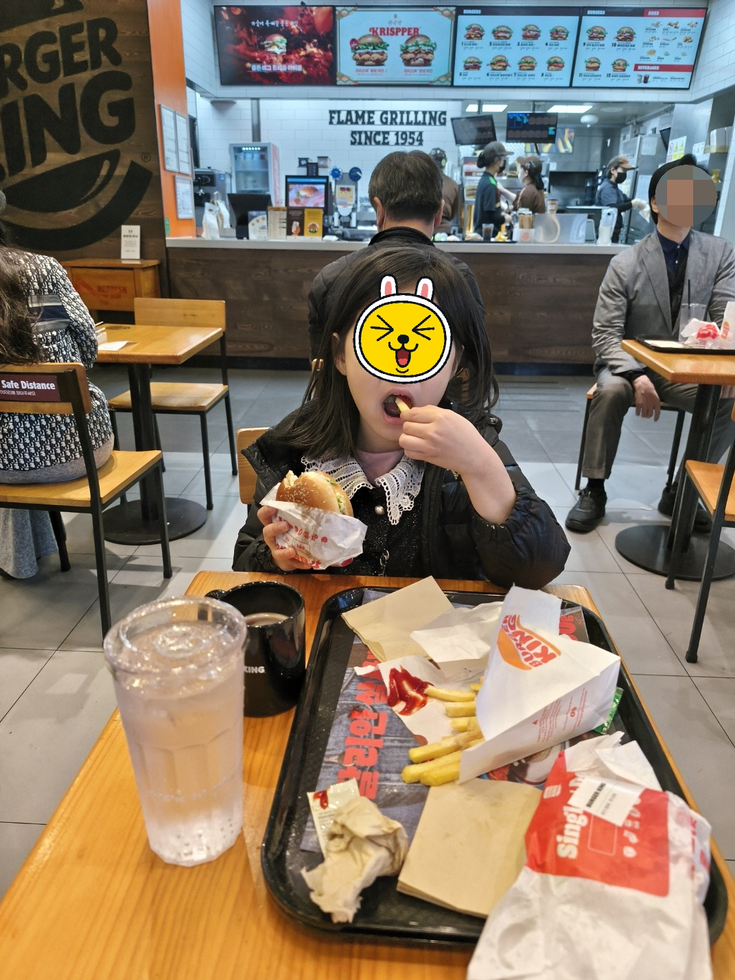 원래 나에게 햄버거란 아이들을 학교와 유치원에 보내고 유모차를 밀다가 막내가 잠들면 몰래 먹는 음식이다. 늘 한 손으로 유모차를 밀며 혼자 먹던 햄버거를 처음으로 매장에 앉아 딸과 마주보고 먹는다. 뭔가 합법적으로 먹는 햄버거 맛이 새롭다.