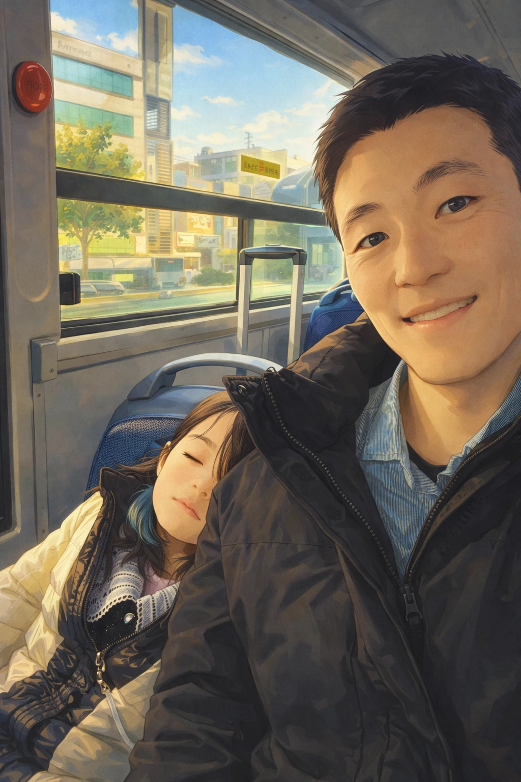 버스를 타고 집으로 돌아오는 길, 빛이와 나란히 앉아 창밖을 보며 이야기를 나눈다.