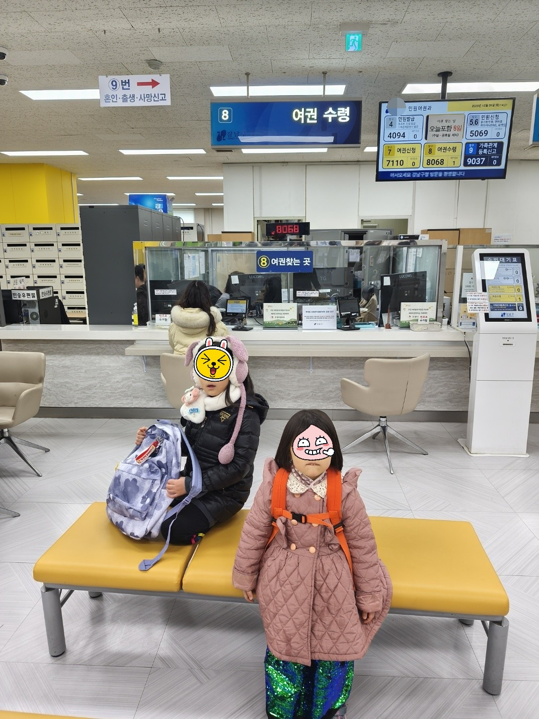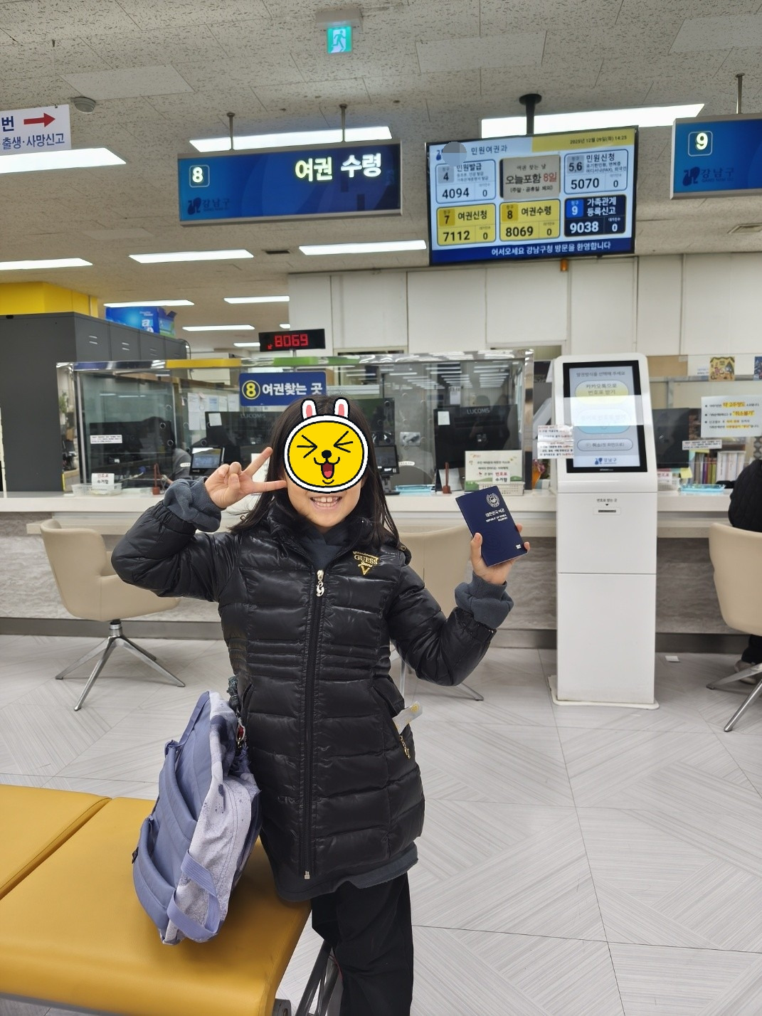 빛이는 한 번 와봤다고 힘찬 발걸음으로 하늘이의 길을 인도한다. 대기가 2명 밖에 없어서 거의 바로 받을 수 있었다. 딸의 생애 첫 여권을 받아 드니 왠지 모르게 경건해진다. 꿈같다.