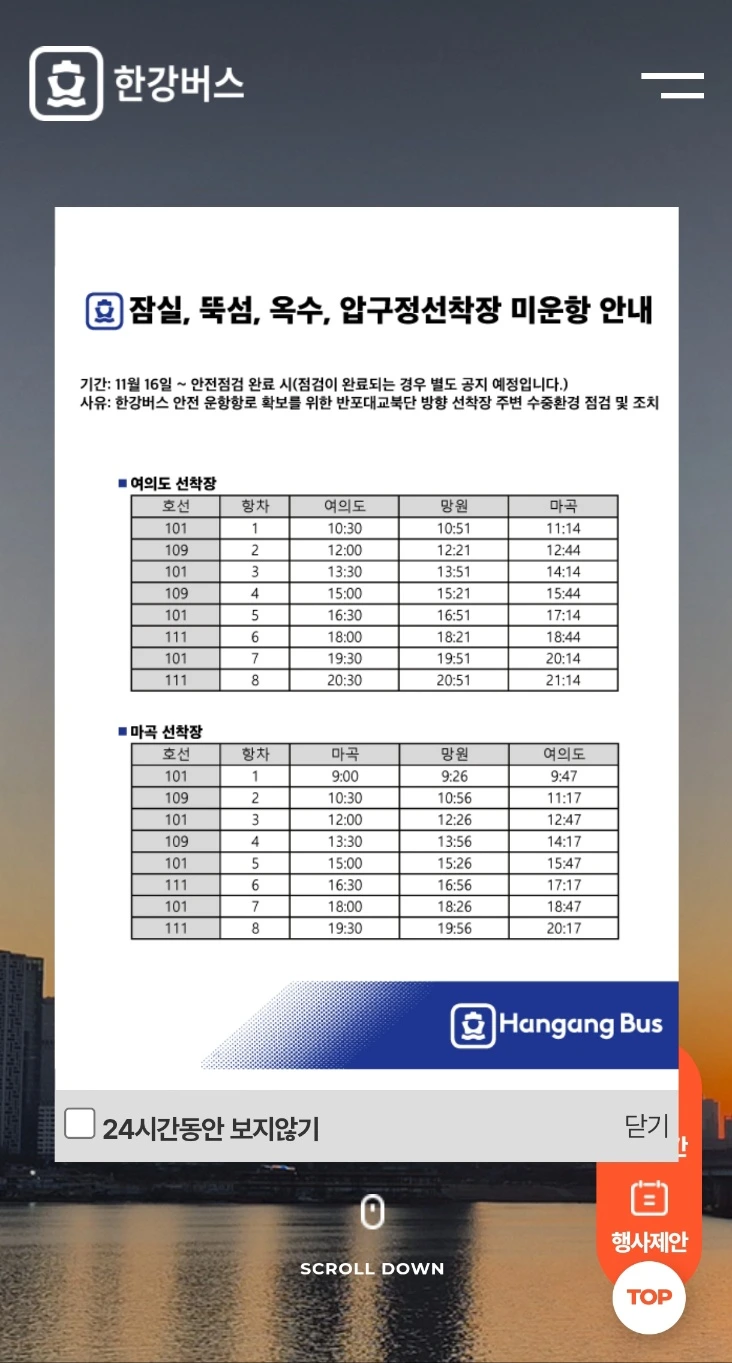 휴대폰으로 한강버스 홈페이지에 들어가는 순간, 버스 안의 난방이 냉방으로 바뀌듯 몸이 얼어붙는 것 같았다.
