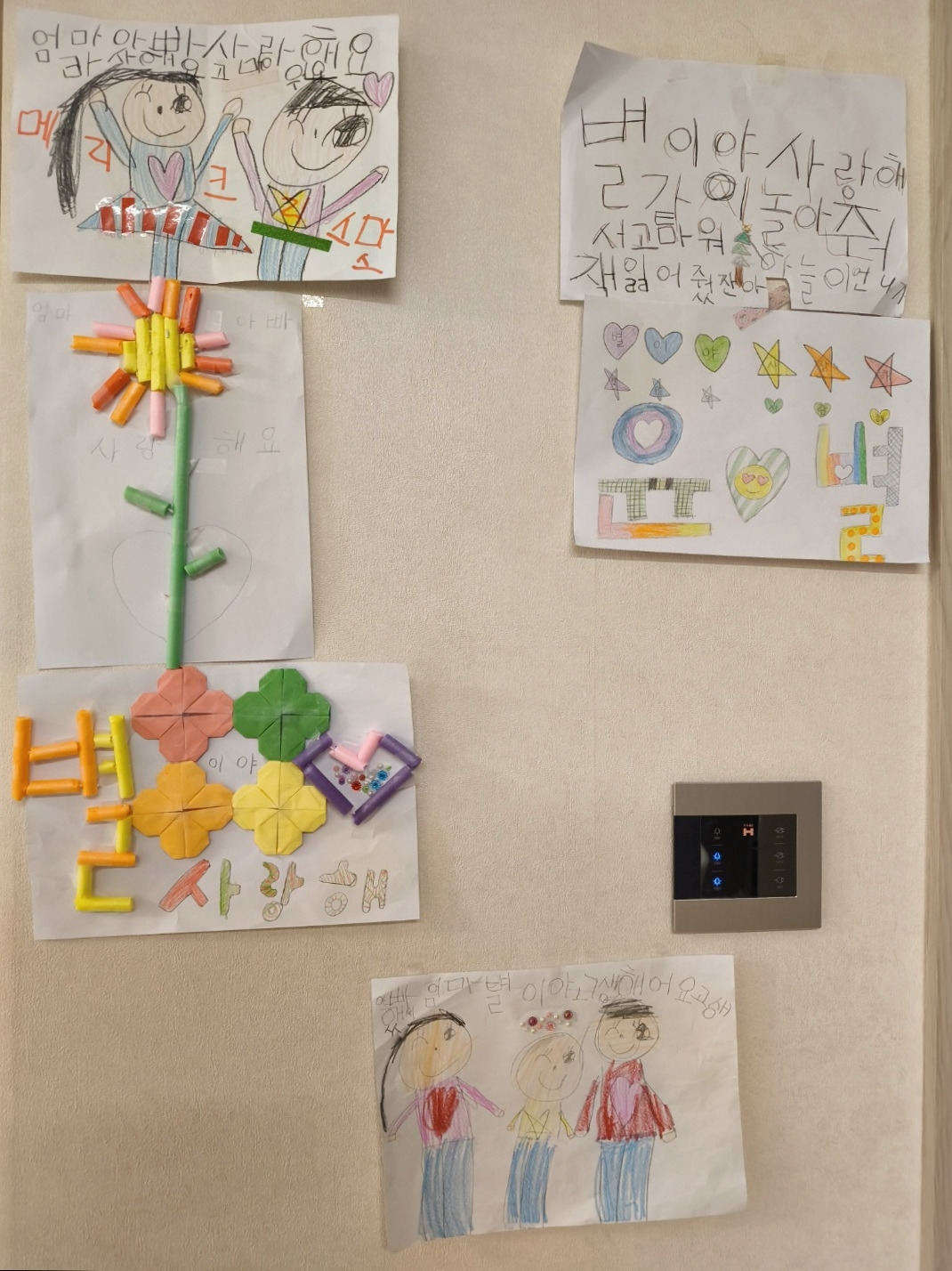그리고 성탄절 당일, 우린 '퇴원'이라는 크리스마스 선물을 받아 드디어 집에 돌아왔다. 벽에는 첫째와 둘째가 준비한 또 다른 선물들이 기다리고 있었다.