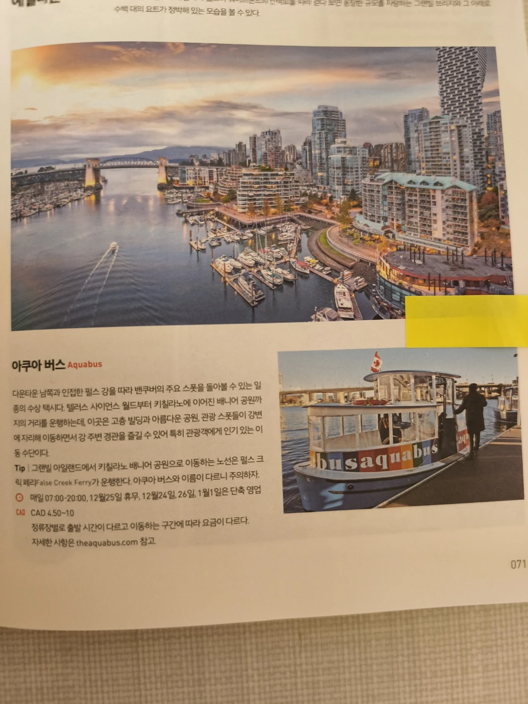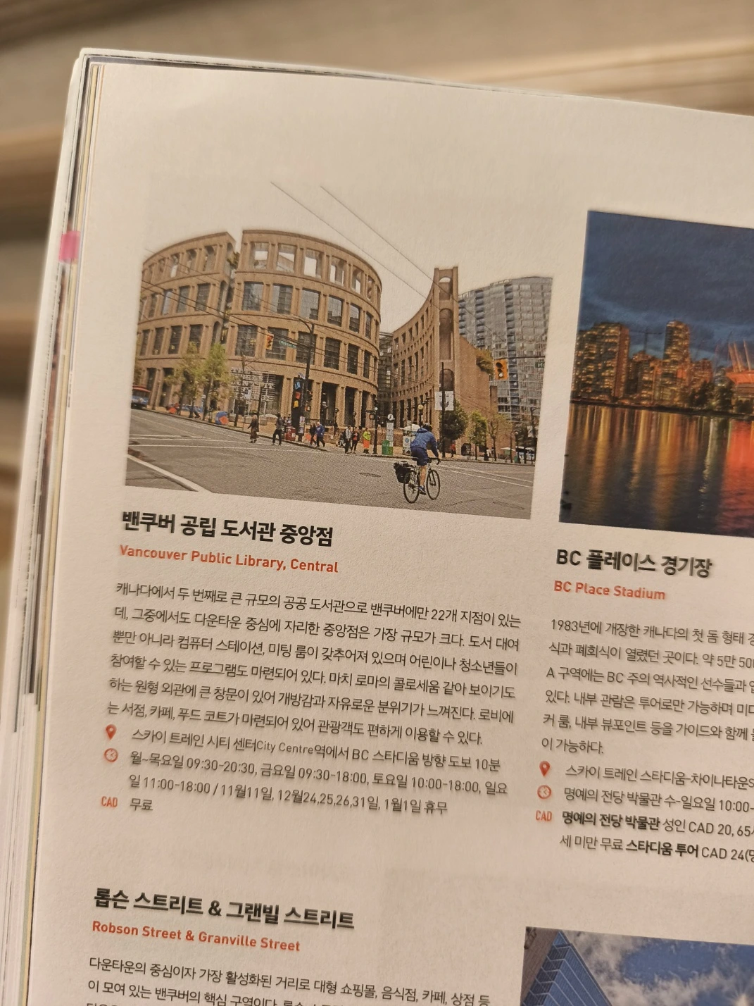 "빛이야, 아빤 어느 도시를 가든 높은 곳에서 내려다보는 걸 좋아하거든? 그래서 '밴쿠버 룩아웃' 여긴 꼭 가봐야겠어. 그리고 여기는 캐나다에서 두 번째로 큰 도서관이라고 하거든? 여기도 한번 가보자. 아빤 딱 이거 두 군데만 가면 돼. 나머지는 네가 다 정해."