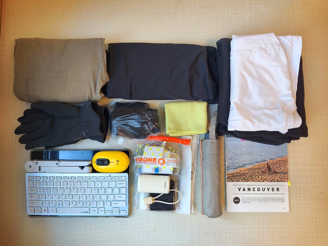 우선 내 짐을 다 모았다. 긴바지, 반바지, 긴팔, 반팔, 장갑, 속옷, 양말, 스포츠 타월, 태블릿, 거치대, 키보드, 마우스, 충전기, 어댑터, 보조배터리, 전기면도기, 로션, 칫솔, 치실, 우산, 가이드북(일부) 정도다.