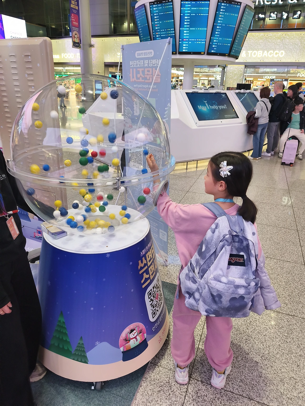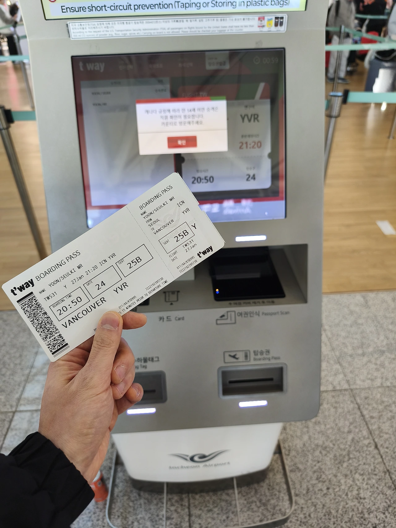 "안녕하세요. 셀프체크인을 했는데요. 아이껀 안 된다고 나오네요? 부칠 짐은 없고요. 티켓만 받으면 돼요."