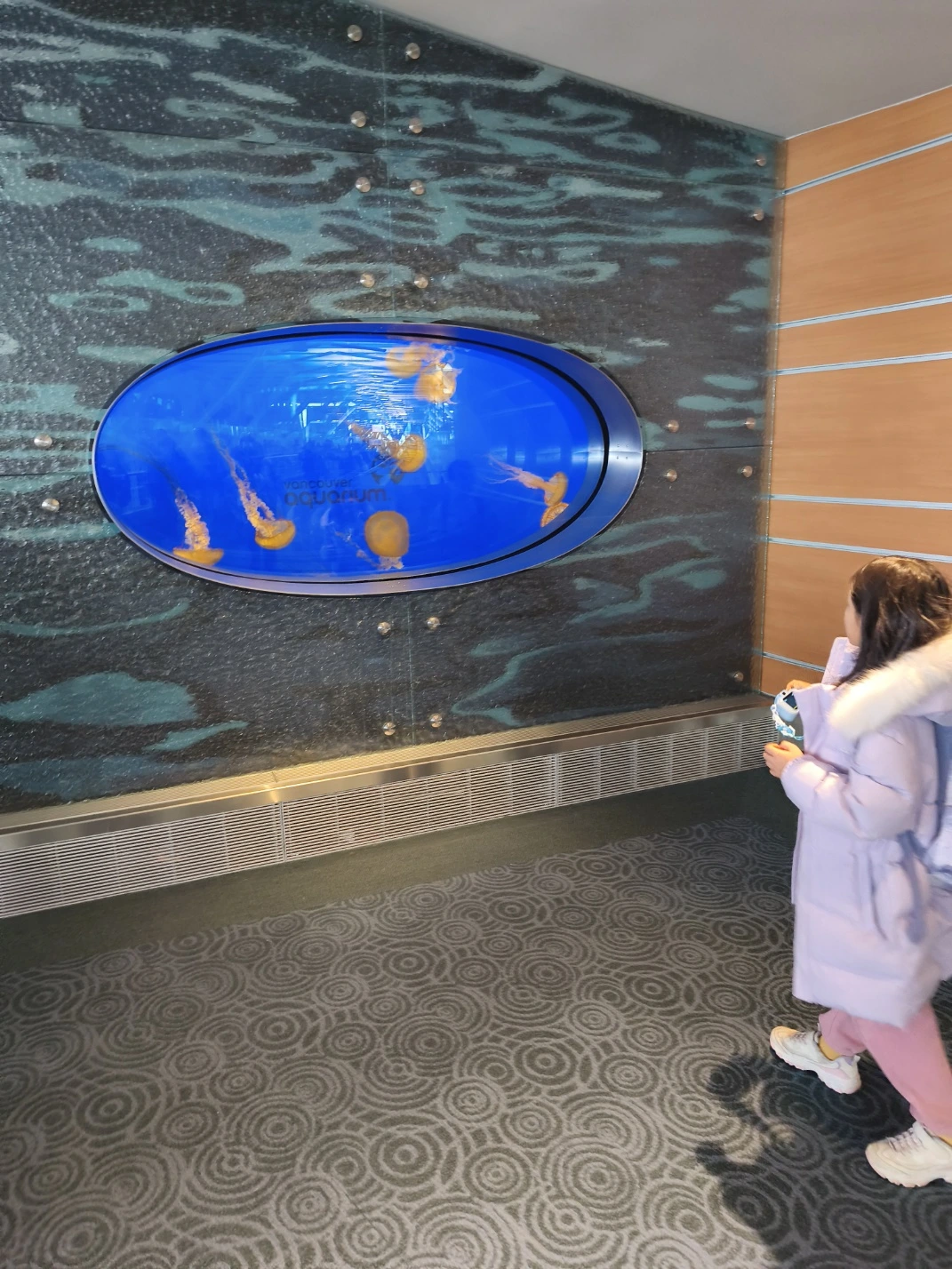 출입국장으로 가는 길에 우리를 가장 먼저 맞이한 건 다름 아닌 '해파리'였다. 줄이 길어지기 전에 빨리 빠져나가고 싶었지만, 춤추는 해파리들이 빛이의 발목을 잡았다.
