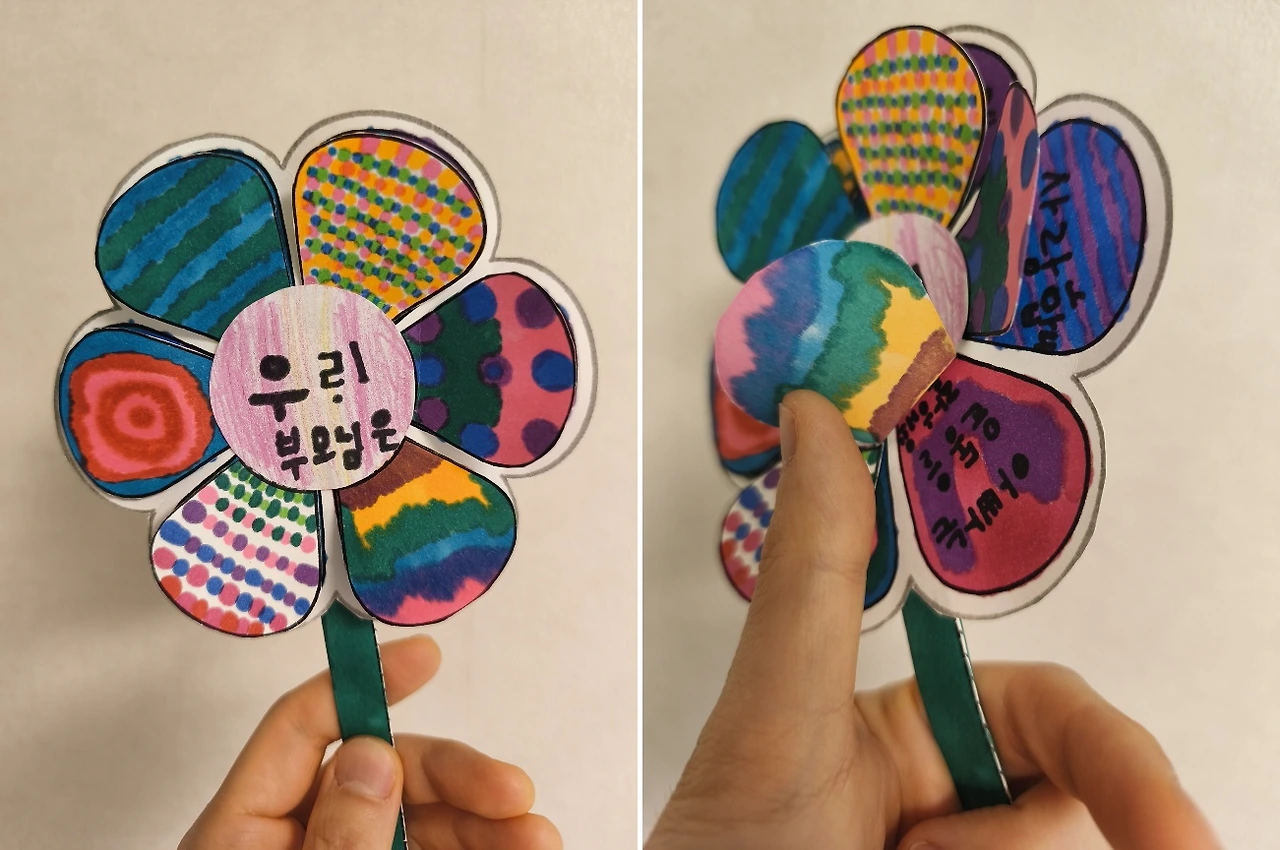 꽃잎을 하나씩 열어보니 거기에는 '사랑합니다.', '아빠는 운동을 잘해요.', '엄마는 친절하세요.', '부모님은 날 사랑해요.' 등의 문구가 차례로 나왔다.