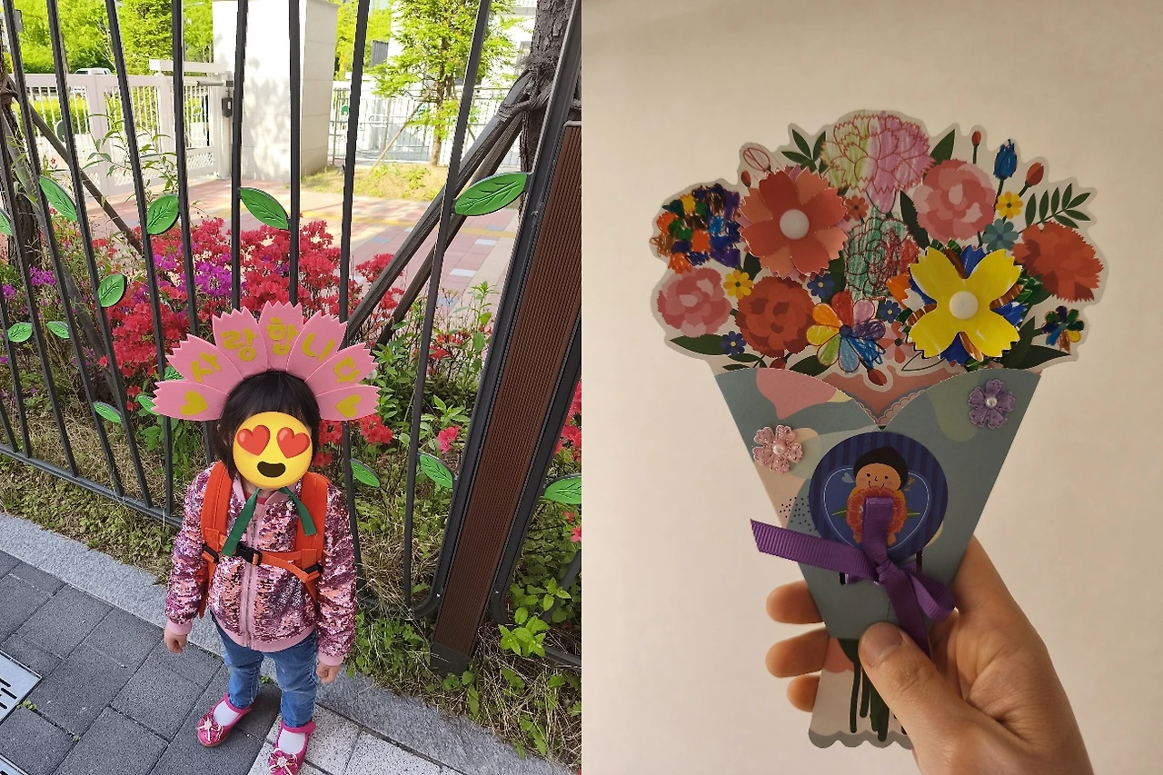 유치원에서 만든 종이 꽃다발을 내민다. 생각지도 못한 선물에 깜짝 놀라는 노력이 필요했다. 얼마나 보여주고 싶었을까. 그 마음 꽁꽁 싸매고 무사히(?) 집까지 도착한 5살 딸의 고군분투에 미소 짓게 된다.