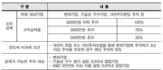 엔젤투자 소득공제 제도의 경우 1997년 처음 시행됐고 정부는 좀 더 요건을 완화하여 소득공제 100%구간을 투자금 3000만원 이하로 늘렸습니다.