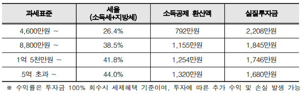 또한 3천만원 투자 시 소득공제 사례는 아래 예시를 통해 소득 구간별로 확인할 수 있습니다.