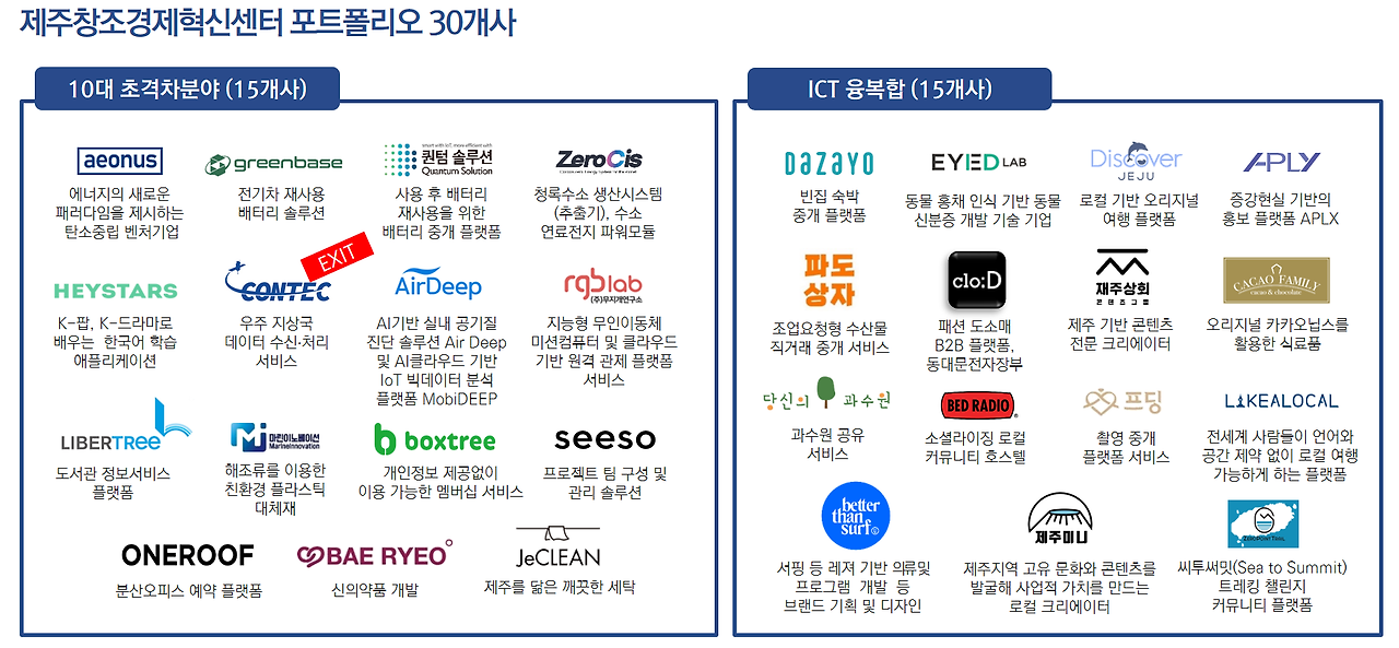 이처럼 제주창조경제혁신센터는 지역에서 초기단계 기업부터 투자를 진행하고 EXIT의 경험까지 보유한 유일한 액셀러레이터입니다.