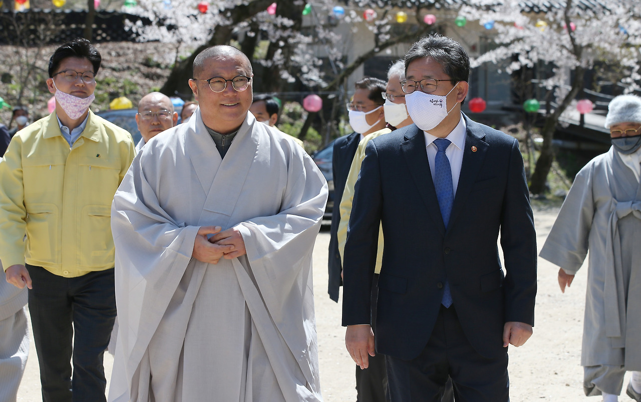 4월 13일 사회적 거리두기 강화 관련 불교계 협조를 위해 공주 마곡사 찾은 박양우 문체부 장관, 김정섭 공주시장, 이우성 충남도 문화체육부지사 일행과 원경 주지스님. 사진=문체부
