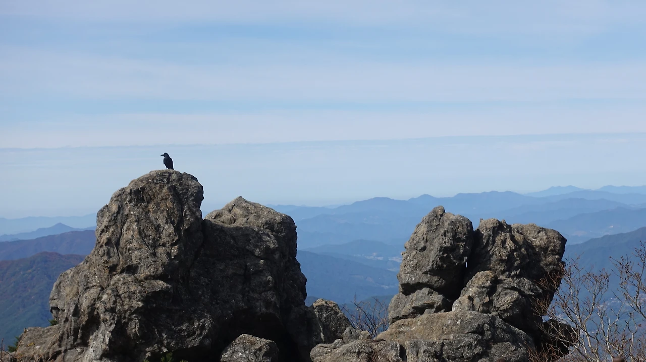 오후 한 시쯤 출발해 700m를 가니 해발 1703m 촛대봉이 있었다. 그 아래에서 배낭을 내리고 잠시 쉬면서 물을 마신 후 빈 몸으로 촛대봉에 올랐다. 저 멀리 천왕봉이 보이는 촛대봉에는 까마귀들이 날아다녔다. 한 마리에게 다른 한 마리가 날아가니 먼저 있던 까마귀가 자리를 옮긴다. 나중에 온 까마귀는 먼저 간 까마귀에게 뭐라고 하는 듯 깍깍거린다.